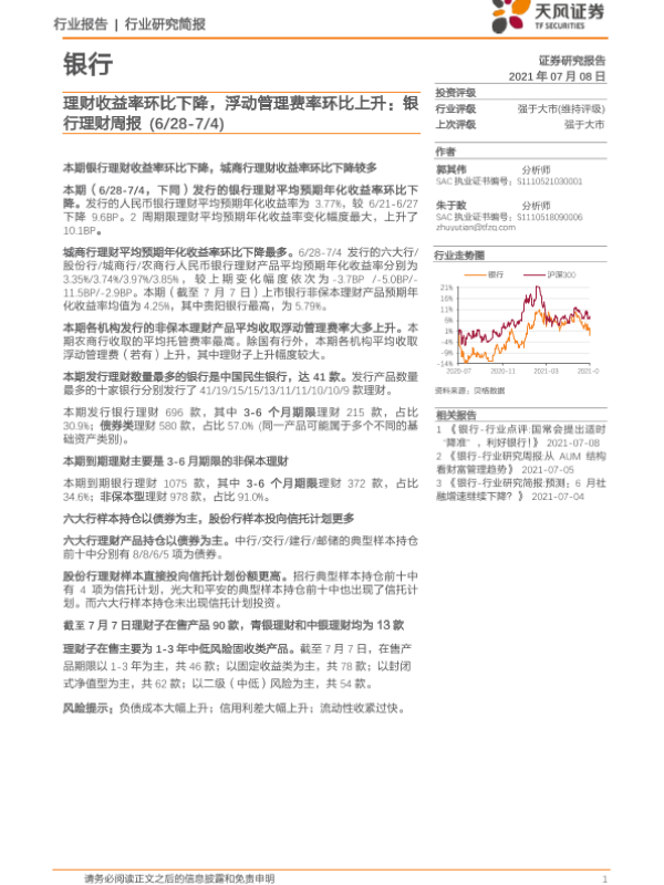 【天风证券】【20210610】银行理财周报:理财收益率环比下降,大行浮动管理费率较高-18页 行业研究