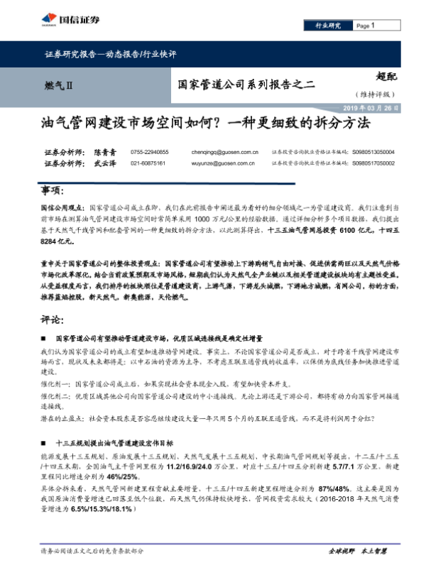 【国信证券】【20190326】国家管道公司系列报告之二:油气管网建设市场空间如何?一种更细致的拆分方法-6页 行业研究