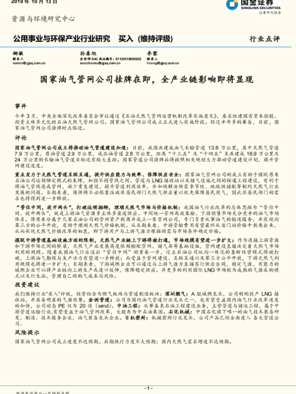 【国金证券】【20191013】国家油气管网公司挂牌在即,全产业链影响即将显现-3页 行业研究