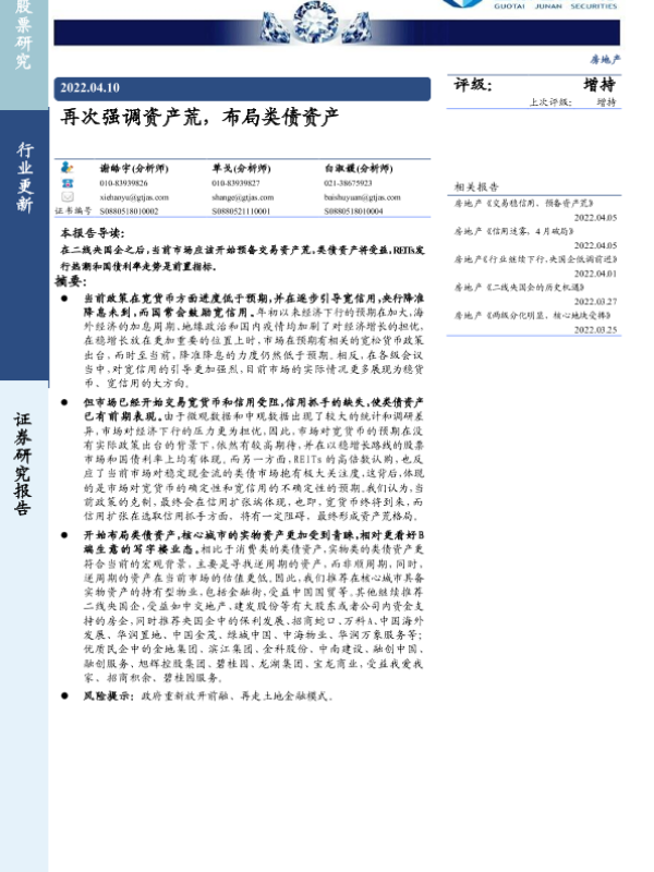 【国泰君安证券】【20220410】房地产行业更新:再次强调资产荒,布局类债资产-3页 行业研究