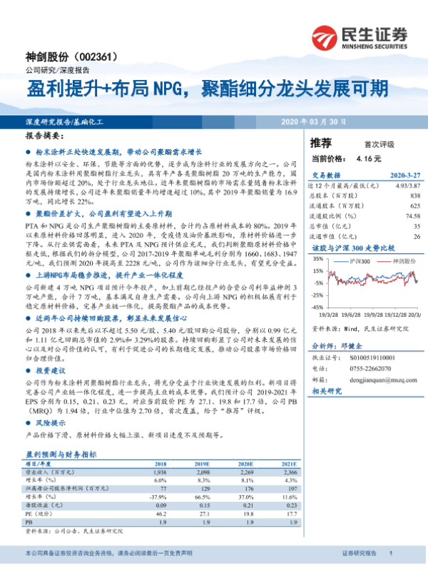 【民生证券】【20200330】神剑股份-盈利提升+布局NPG,聚酯细分龙头发展可期-24页 行业研究