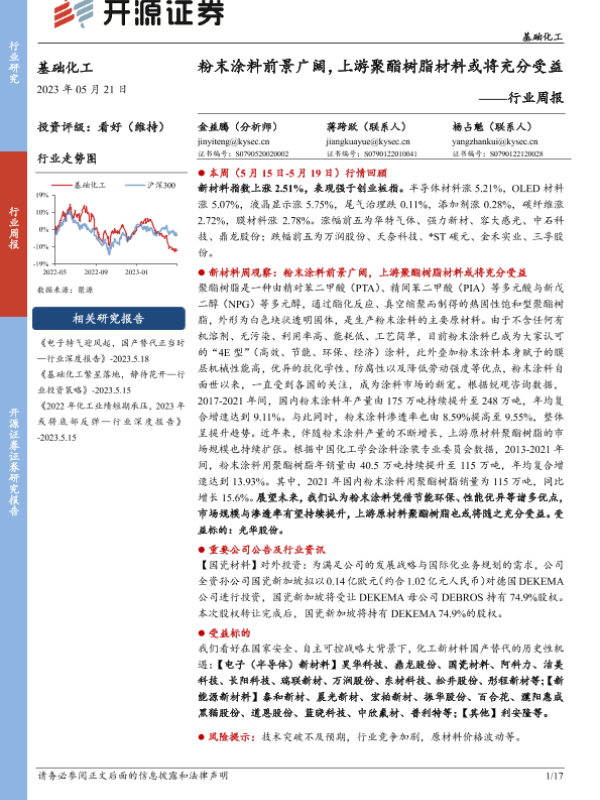 【开源证券】【20230521】20230521-开源证券-基础化工行业周报:粉末涂料前景广阔,上游聚酯树脂材料或将充分受益-17页 行业研究