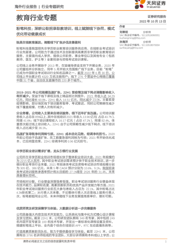 【天风证券】【20221013】教育行业专题:粉笔科技:深耕公职招录职教培训,线上赋能线下协同,模式优化带动健康成长-20页 行业研究