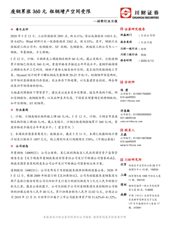 【川财证券】【20200512】材料行业日报:废钢累涨360元 粗钢增产空间受限-3页 证券期货研究报告