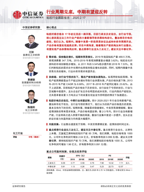 【中信证券】【20200217】粘胶行业跟踪报告:行业周期见底,中期有望迎反转-18页 行业研究