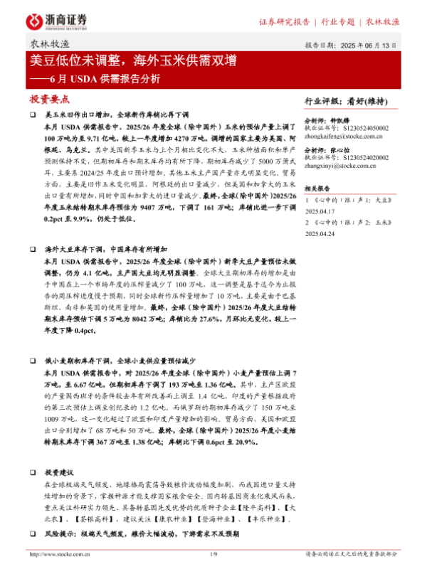 【浙商证券】【20250613】6月USDA供需报告分析_美豆低位未调整_海外玉米供需双增-9页 证券期货研究报告