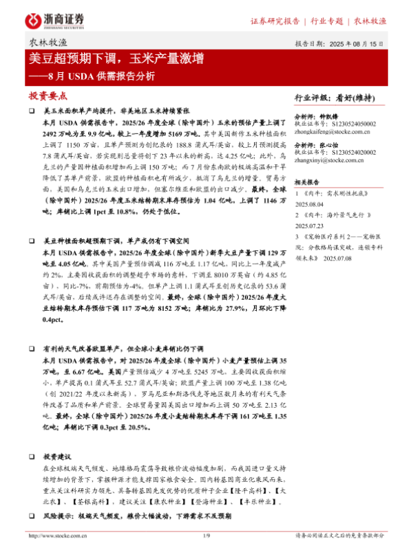 【浙商证券】【20250815】8月USDA供需报告分析-美豆超预期下调_玉米产量激增-9页 证券期货研究报告