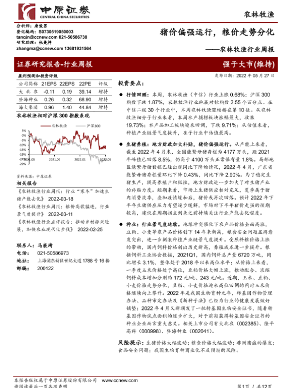【中原证券】【20220527】农林牧渔行业周报:猪价偏强运行,粮价走势分化-12页 行业研究