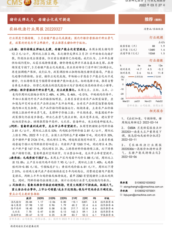 【海通证券】【20220327】农林牧渔行业周报:猪价反弹乏力,母猪去化或可提速-12页 证券期货研究报告