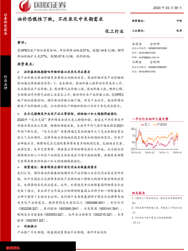 【国联证券】【20200309】化工行业:油价恐慌性下跌,不改农化中长期需求-4页 行业研究