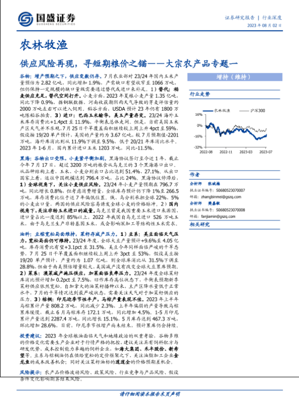 【国盛证券】【20230802】农林牧渔:大宗农产品专题一-供应风险再现,寻短期粮价之锚-18页 行业研究