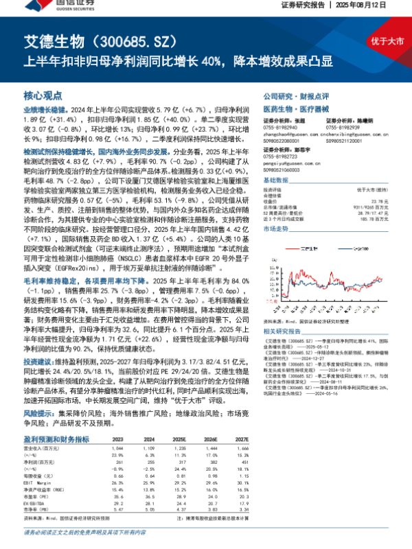 【国信证券】【20250812】艾德生物-300685-上半年扣非归母净利润同比增长40%,降本增效成果凸显-7页 证券期货研究报告