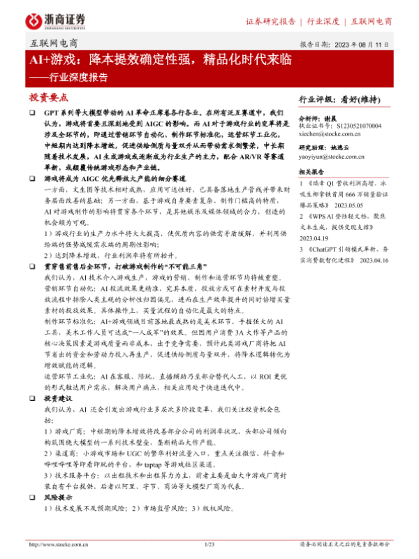 【浙商证券】【20230811】互联网电商行业深度报告:AI+游戏:降本提效确定性强,精品化时代来临-23页 行业研究