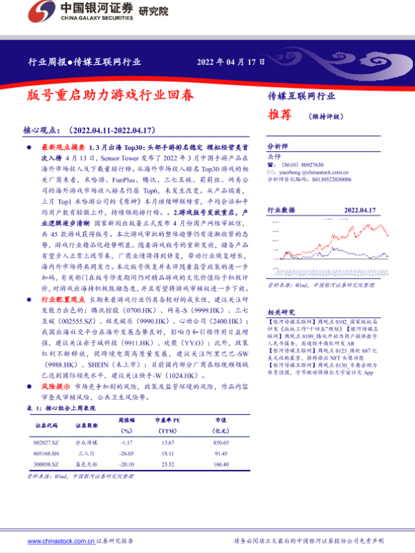 【银河证券】【20220417】传媒互联网行业周报:版号重启助力游戏行业回春-38页 行业研究