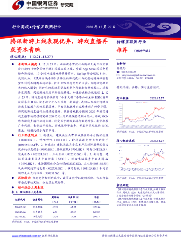 【银河证券】【20201227】传媒互联网行业:腾讯新游上线表现优异,游戏直播再获资本青睐-33页 行业研究