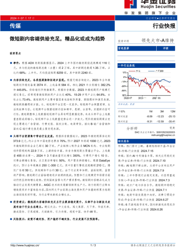 【华金证券】【20240717】传媒:微短剧内容端供给充足,精品化或成为趋势-3页 行业研究