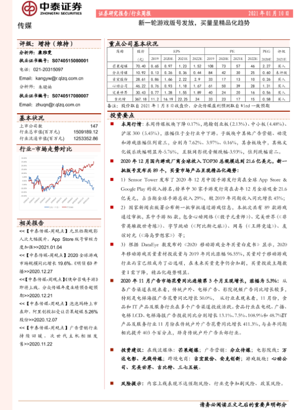 【中泰证券】【20210110】20210110-中泰证券-传媒行业周报:新一轮游戏版号发放,买量呈精品化趋势-12页 行业研究