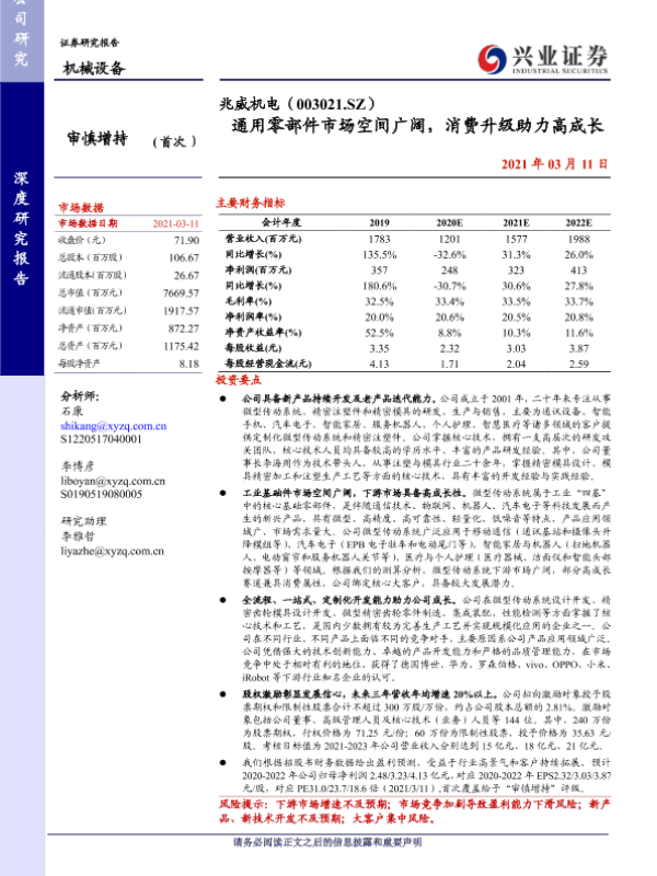 【兴业证券】【20210311】兆威机电(003021.SZ)通用零部件市场空间广阔,消费升级助力高成长-42页 行业研究