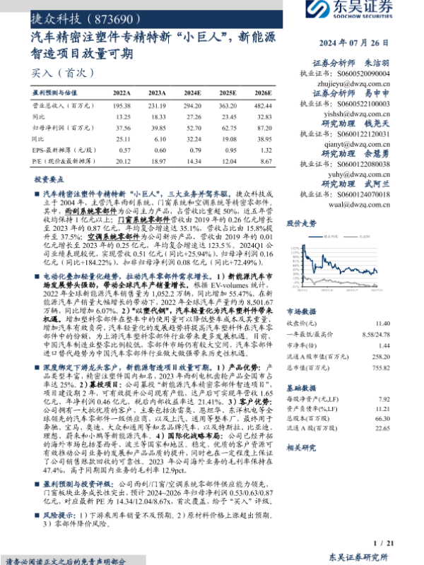 【东吴证券】【20240726】捷众科技(873690)汽车精密注塑件专精特新“小巨人”,新能源智造项目放量可期-21页 行业研究