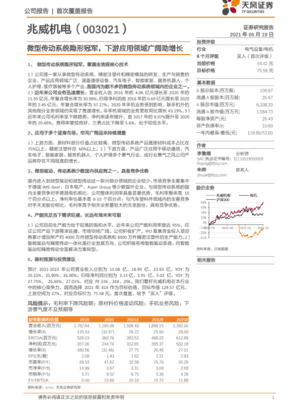 【天风证券】【20210519】兆威机电-003021.SZ-微型传动系统隐形冠军,下游应用领域广阔助增长-26页 行业研究