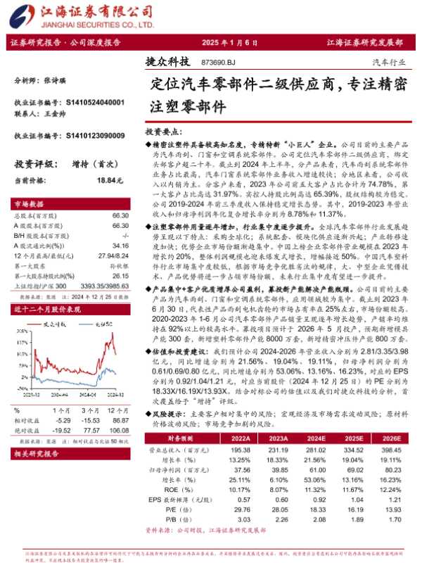 【江海证券】【20250106】捷众科技(873690)定位汽车零部件二级供应商,专注精密注塑零部件-28页 行业研究