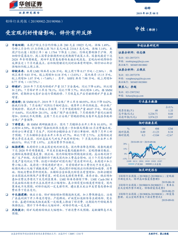 【华创证券】【20190908】20190908-华创证券-铅锌行业周报:受宏观利好情绪影响,锌价有所反弹-18页 行业研究