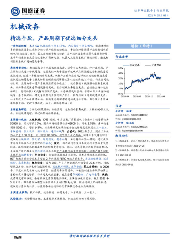 【国盛证券】【20210509】20210509-国盛证券-机械设备行业周报:精选个股,产品周期下优选细分龙头-13页 行业研究