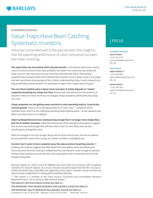 【巴克莱资本公司 (Barclays Capital Inc.)】【20220216】巴克莱-美股投资策略-价值陷阱一直困扰着系统性投资者-27页 行业研究