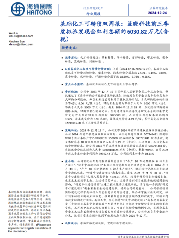 【海通国际】【20241224】基础化工可转债双周报:蓝晓科技前三季度拟派发现金红利总额约6030.82万元(含税)-21页 行业研究