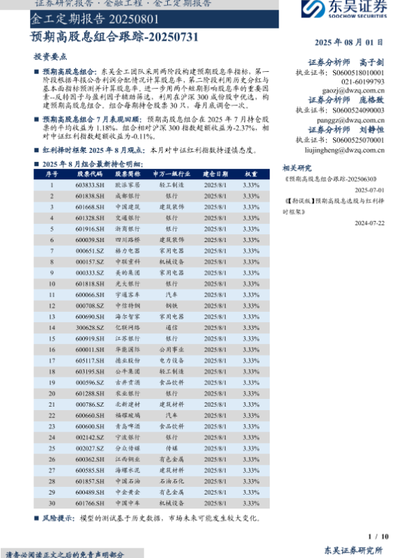 【东吴证券】【20250801】预期高股息组合跟踪-10页 证券期货研究报告