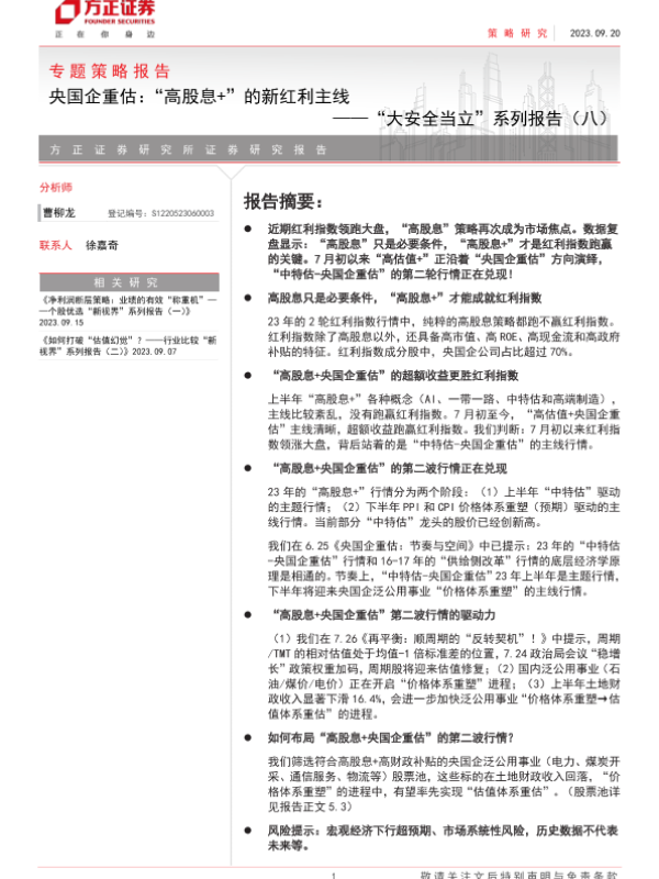 【方正证券】【20230920】“大安全当立”系列报告(八):央国企重估,“高股息+”的新红利主线-17页 行业研究