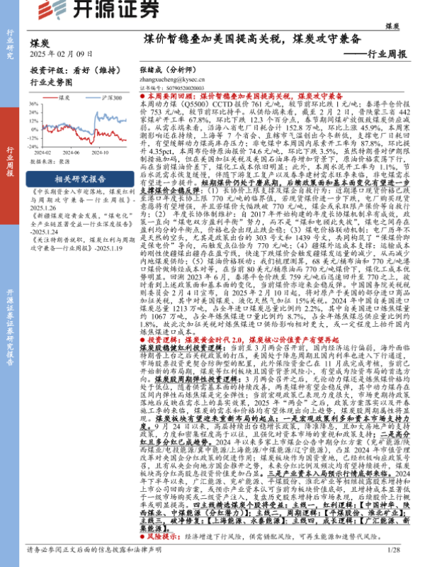 【开源证券】【20250209】煤炭行业周报:煤价暂稳叠加美国提高关税,煤炭攻守兼备-28页 行业研究
