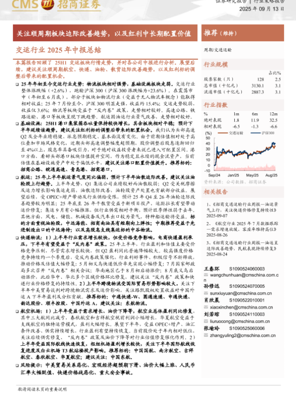 【海通证券】【202509】交运行业2025年中报总结:关注顺周期板块边际改善趋势,以及红利中长期配置价值-14页 证券期货研究报告