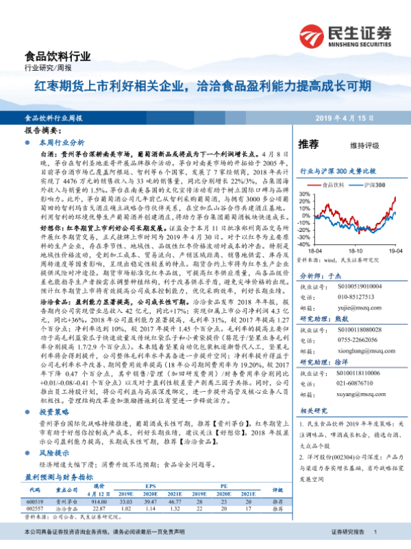 【民生证券】【20190415】20190415-民生证券-食品饮料行业周报:红枣期货上市利好相关企业,洽洽食品盈利能力提高成长可期-26页 行业研究
