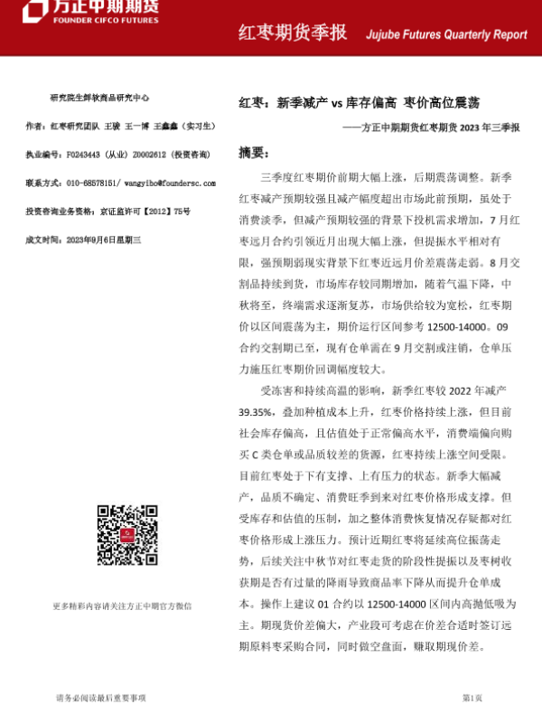 【方正中期期货】【20230906】红枣期货2023年三季报:新季减产vs库存偏高,枣价高位震荡-21页 行业研究