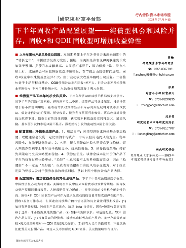 【招商银行】【20230714】下半年固收产品配置展望:纯债型机会和风险并存,固收+和QDII固收型可增加收益弹性-15页 行业研究