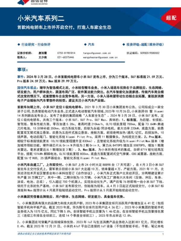 【国信证券】【20240407】小米汽车系列二:首款纯电轿车上市并开启交付,打造人车家全生态-10页 行业研究