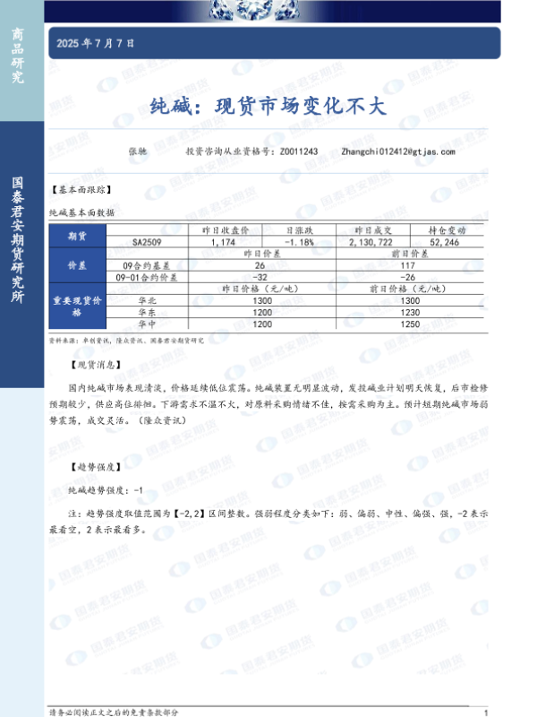 【国泰君安期货】【20250707】纯碱:现货市场变化不大-2页 证券期货研究报告