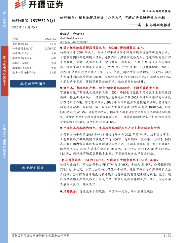 【开源证券】【20221205】新三板公司研究报告:纳科诺尔:锂电池辊压设备“小巨人”,下游扩产业绩迎来上升期-28页 行业研究