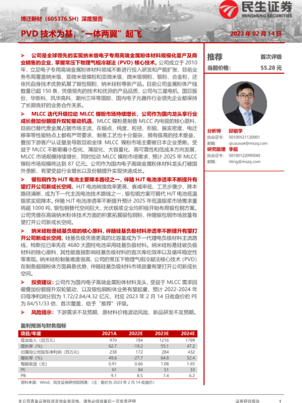 【民生证券】【20230214】20230214-民生证券-博迁新材-605376.SH-深度报告:PVD技术为基,“一体两翼”起飞-47页 行业研究