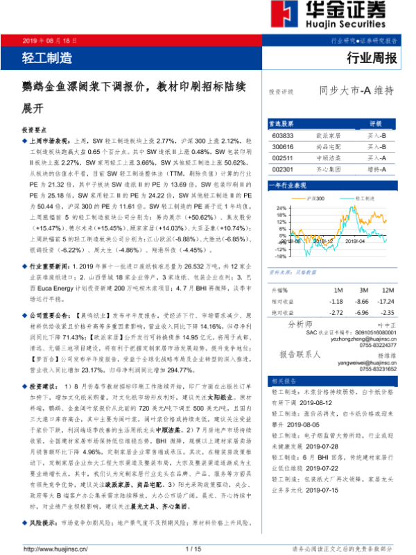 【华金证券】【20190818】20190818-华金证券-轻工制造行业周报:鹦鹉金鱼漂阔浆下调报价,教材印刷招标陆续展开-15页 行业研究