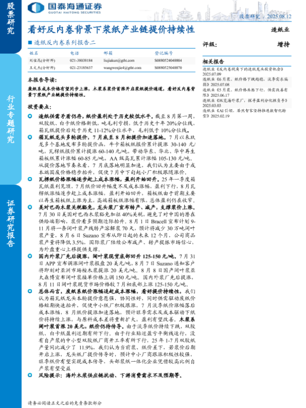 【国泰海通证券】【20250812】看好反内卷背景下浆纸产业链提价持续性-10页 证券期货研究报告