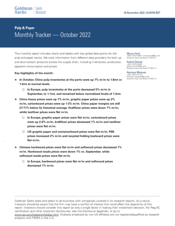 【Goldman Sachs】【20221116】Pulp & Paper_ Monthly Tracker — October 2022-15页 行业研究