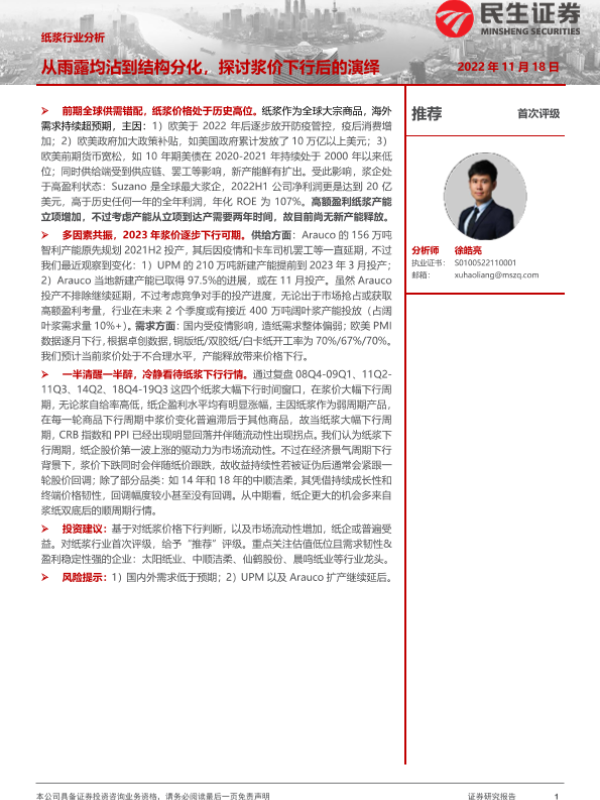 【民生证券】【20221118】纸浆行业分析:从雨露均沾到结构分化,探讨浆价下行后的演绎-26页 行业研究