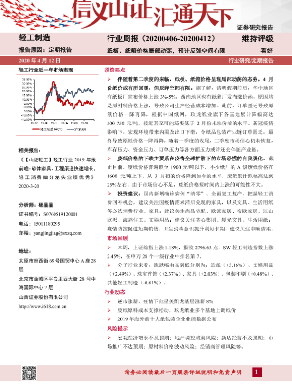 【山西证券】【20200412】20200412-山西证券-轻工制造行业周报:纸板、纸箱价格局部动荡,预计反弹空间有限-13页 行业研究