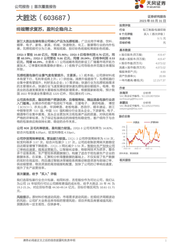 【天风证券】【20230331】大胜达(603687)终端需求复苏,盈利企稳向上-22页 行业研究
