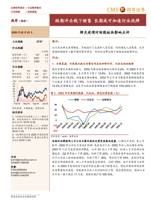【海通证券】【20200203】肺炎疫情对纺服板块影响点评:短期冲击线下销售 长期或可加速行业洗牌-4页 行业研究