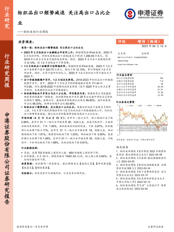 【申港证券】【20230416】20230416-申港证券-轻纺美妆行业周报:纺织品出口颓势减退 关注高出口占比企业-12页 行业研究