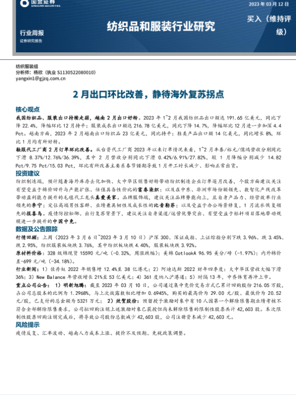 【国金证券】【20230312】20230312-国金证券-纺织品和服装行业研究:2月出口环比改善,静待海外复苏拐点-12页 行业研究