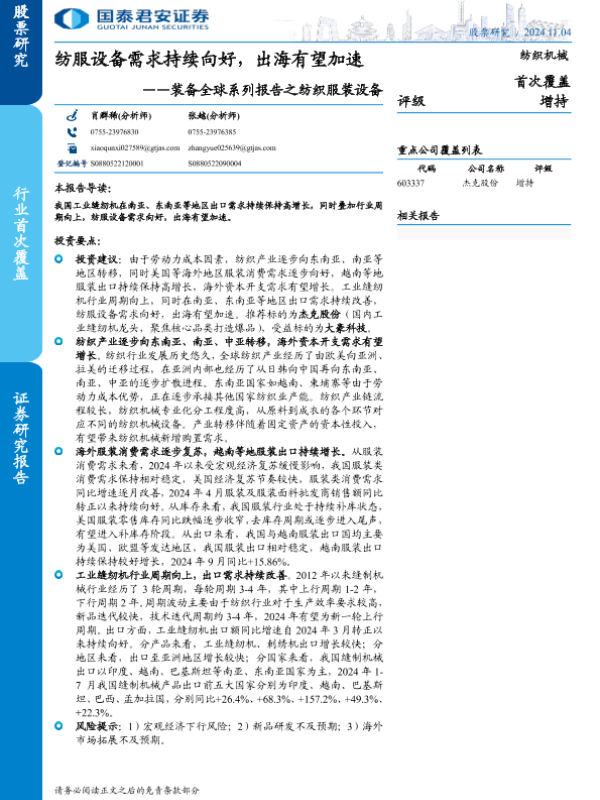 【国泰君安证券】【20241104】纺织机械行业装备全球系列报告之纺织服装设备:纺服设备需求持续向好,出海有望加速-25页 行业研究